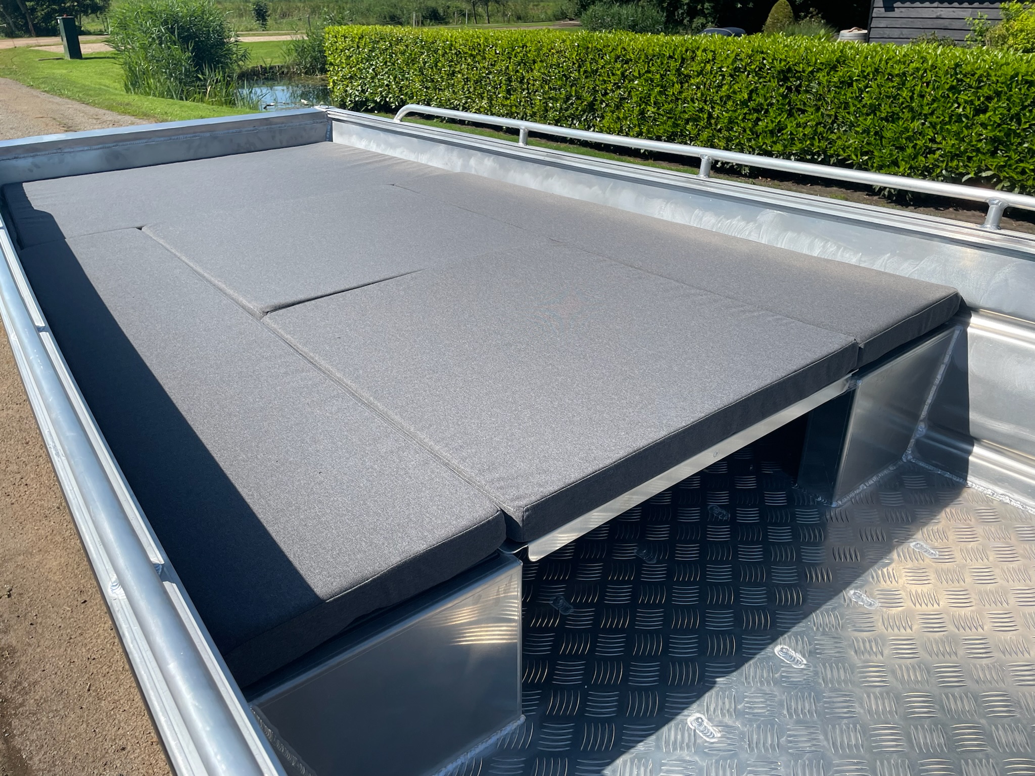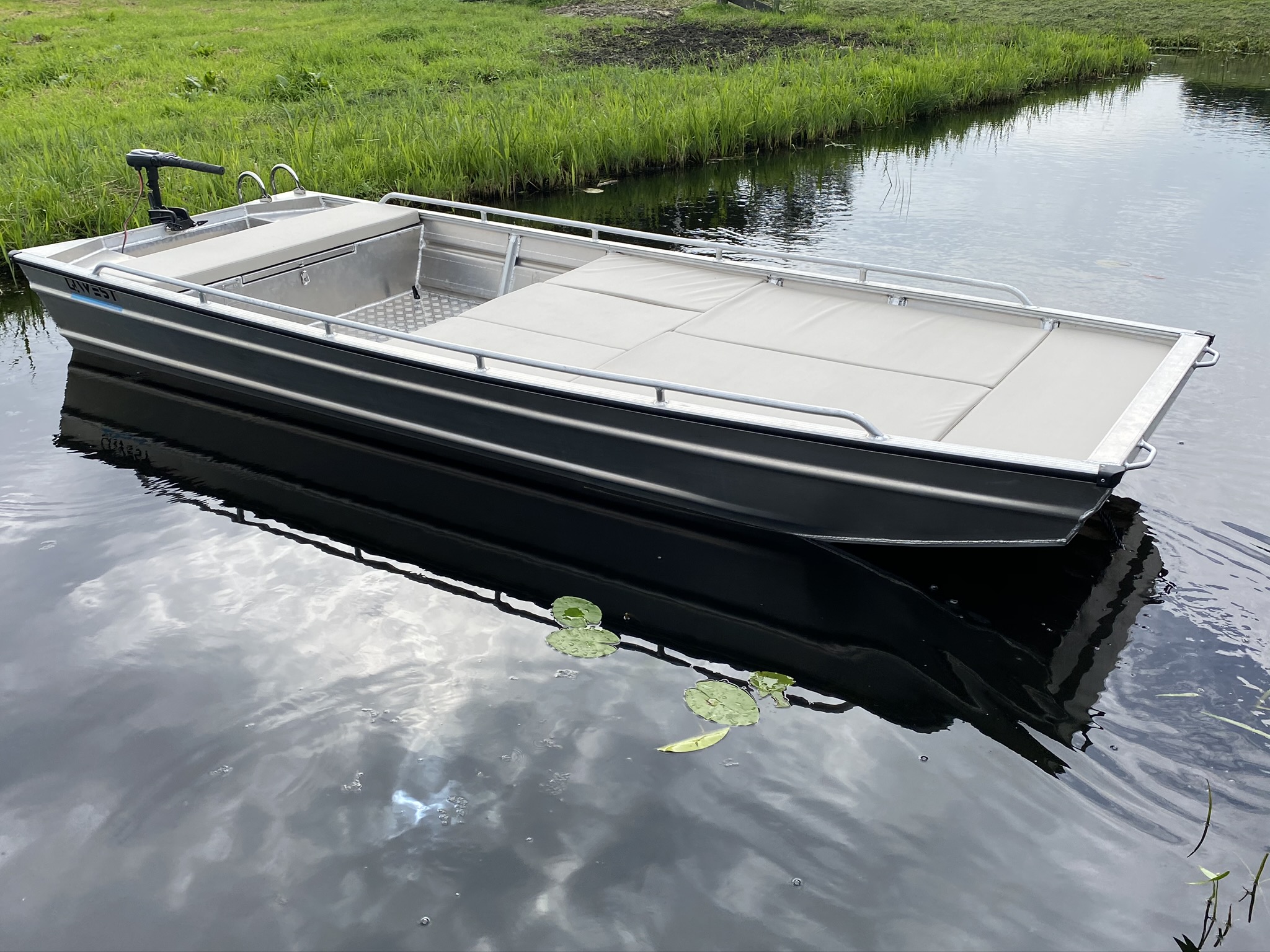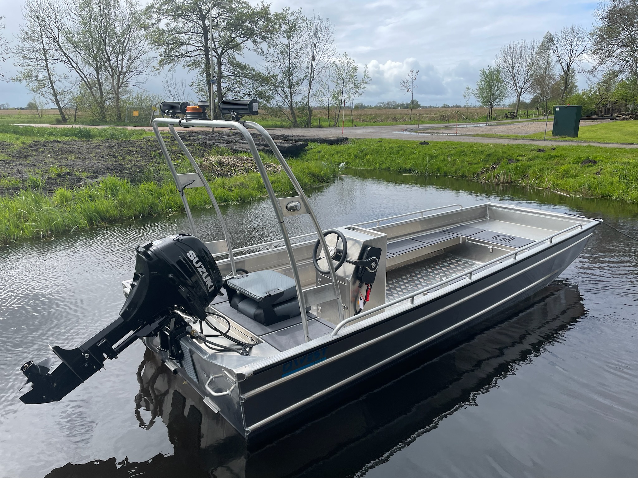 De QWEST F452 is een zelflozende platbodem boot en is erg robuust en zeer compleet afgewerkt. Dit komt voornamelijk door een geheel afgelaste constructie in 3mm. aluminium, luiken met gasveren, rondzit, etc. De boot is koersvast en voelt erg stabiel aan door de breedte van het onderwaterschip. De boot zelf is dus gemaakt van 3 millimeter aluminium, heeft een afgelaste vloer en een spiegel van 4mm dikte. Zowel elektrisch varen met fluistermotor als een benzinemotor tot zelfs 30PK is mogelijk. In tegenstelling tot de kleinere Qwest F-serie modellen is dit een langstaart uitvoering!