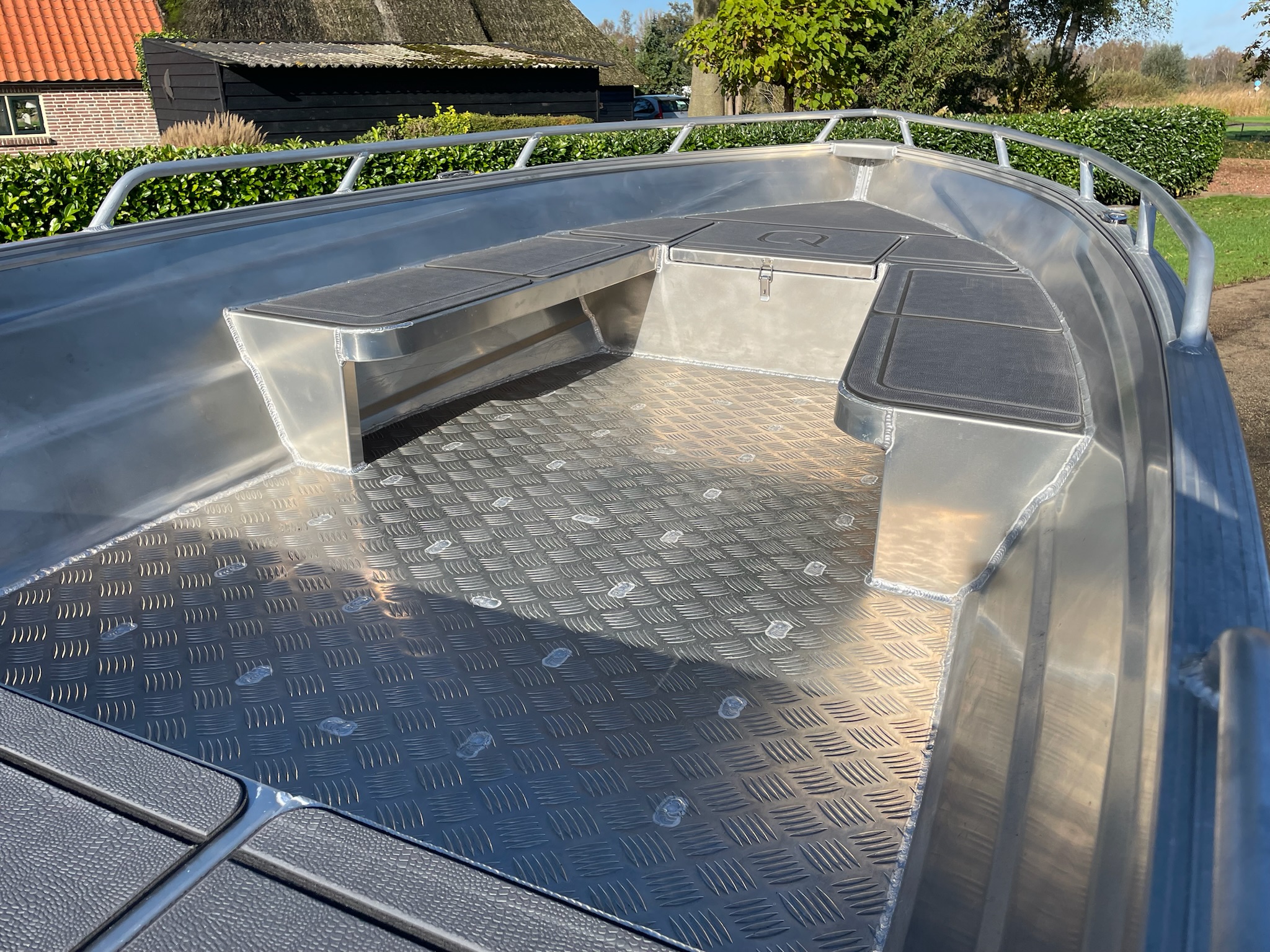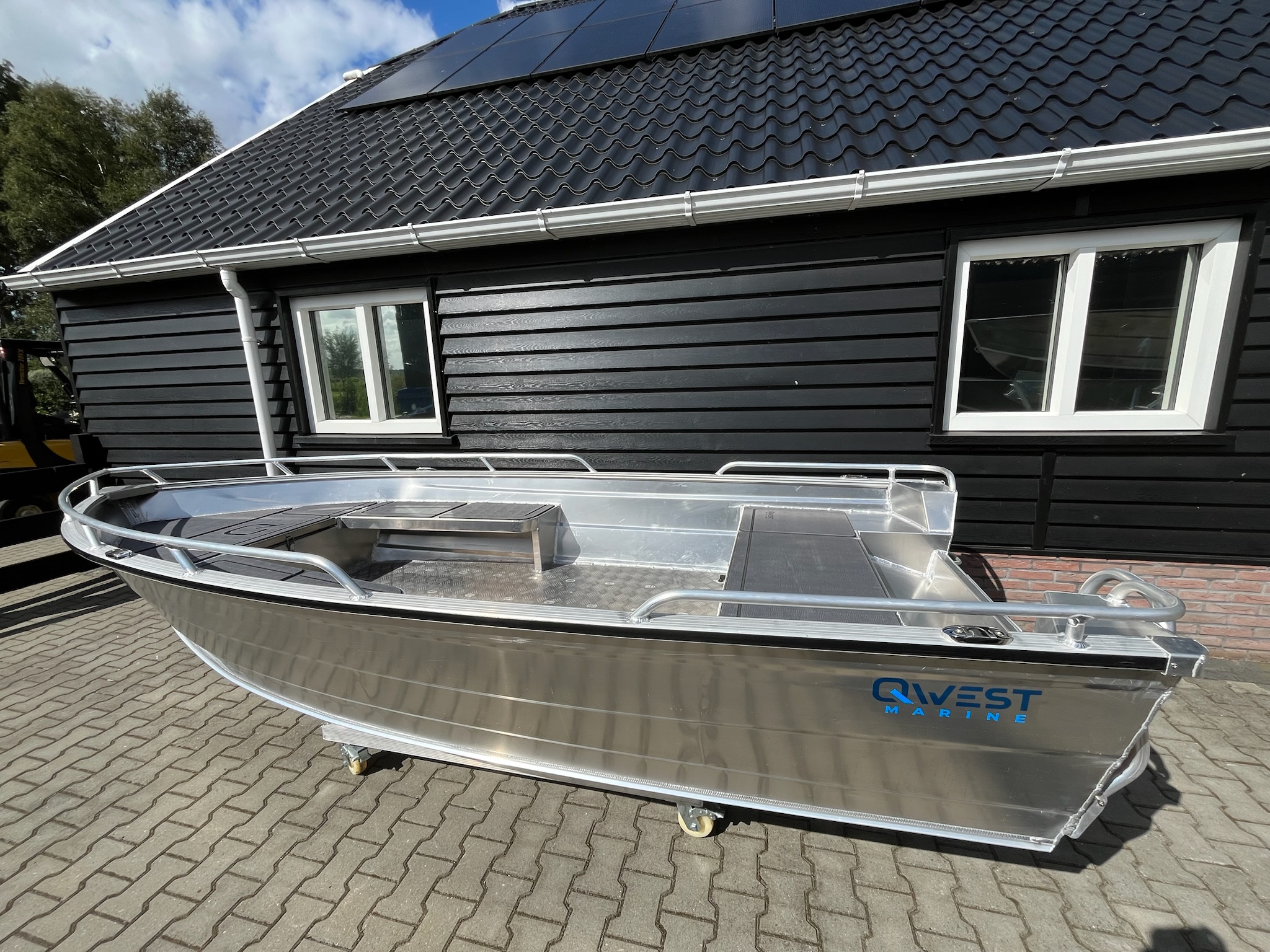 De Qwest R400 blinkt uit in flexibiliteit. Door zijn geheel gelaste 3mm. aluminium romp en een zelflozende kuip met dubbele bodem is het een zeer solide basis voor toerboot of visboot. De kleinste telg van de Qwest R-serie wordt standaard geleverd zonder console maar kan ook uitgerust worden met stuurinrichting en kussenset. Tot 20PK (kortstaart) kan gemonteerd worden en met standaard railing, zwemtrap en gasveren op de bakskisten is deze aluminium boot praktisch onverslaanbaar. Op een ongeremde boottrailer is deze boot makkelijk te vervoeren. De R400 is bij ons in de showroom te bekijken en graag informeren wij u hier verder.