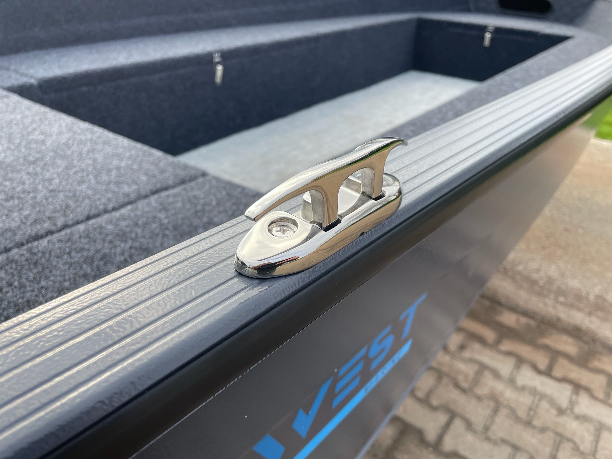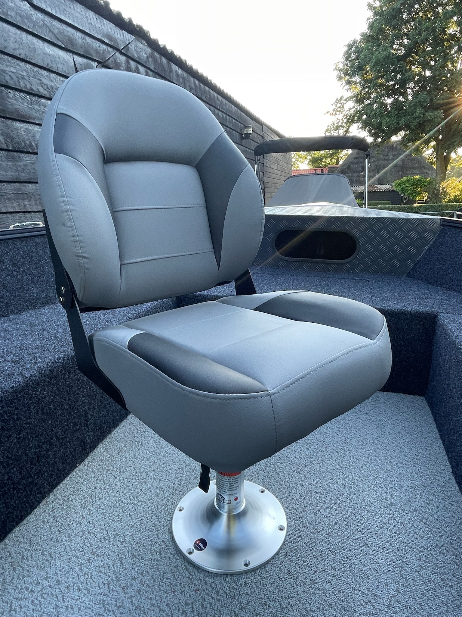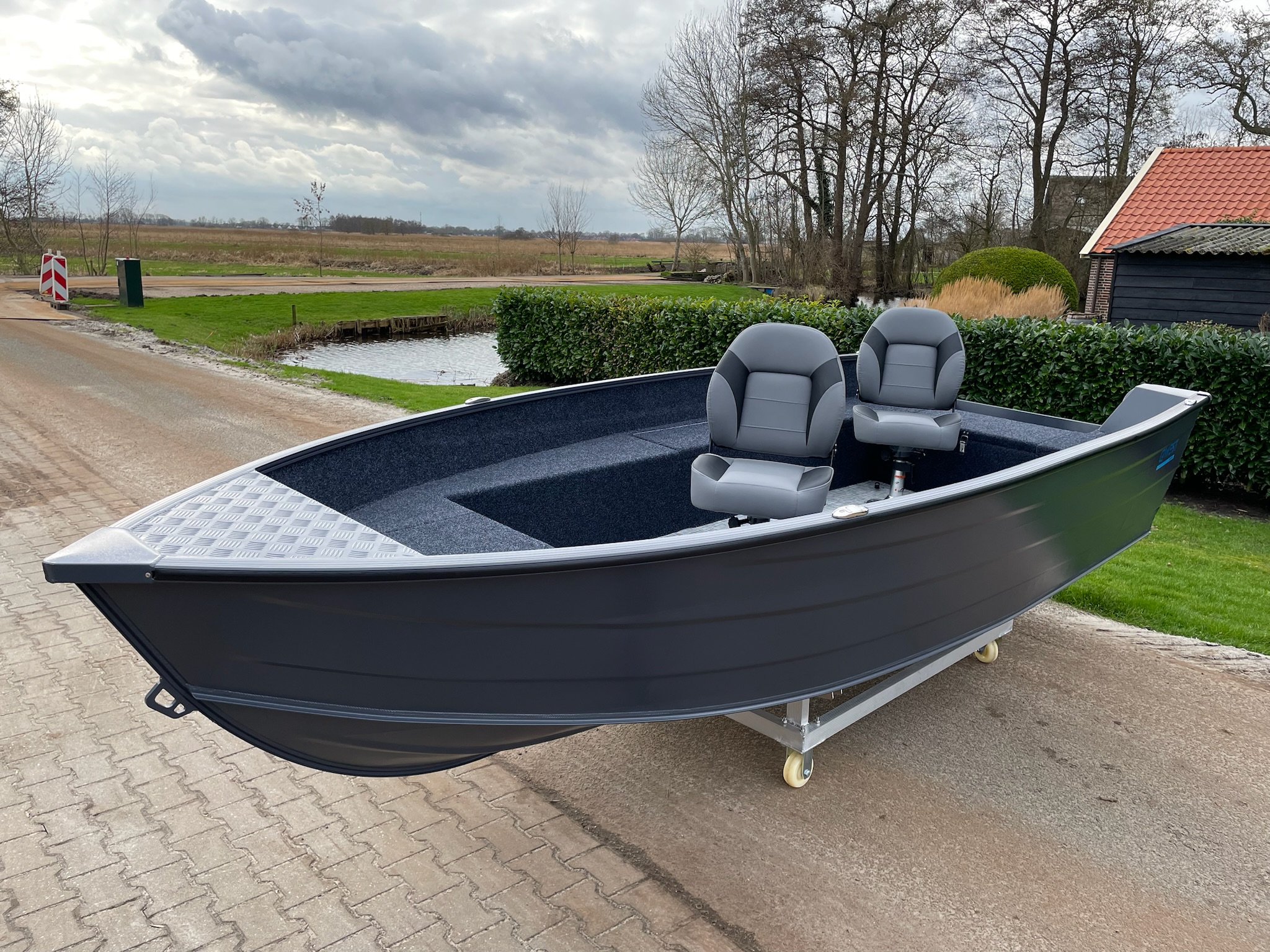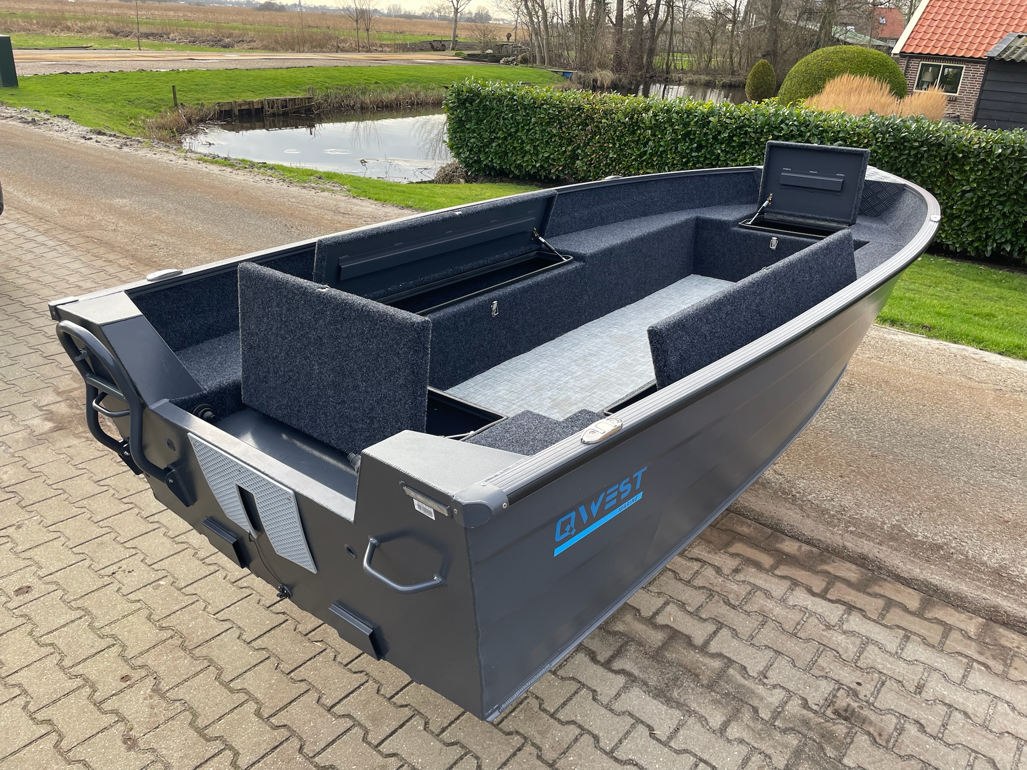 De RF454 is in de basis dezelfde boot met gelijke romp dan de RF450 maar deze visboot komt geheel gestoffeerd en met antraciet gepoedercoate romp. Deze Qwest wordt door onze klanten gebruikt op veel veel visplekken in Nederland en België maar ook tripjes naar Zweden zijn op een goede boottrailer prima te doen! D.m.v. de fronttroller voorbereiding, handige stootlijst voor Railblaza accessoires, hengelbakken en 2 kolomstoelen is het een luxe en prima in te delen visboot. Er kan maximaal 30PK achter de Qwest RF454 en met zijn 3mm. gelaste V- romp, dubbele zelflozende bodem komt en zeer goede vaareigenschappen komt hij daarmee snel uit de voeten. Bij Botenfabriek staat hij op de showroom, voeren wij hem naar wens uit en kunnen wij deze visboot ook nog eens laten wrappen in eigen design!